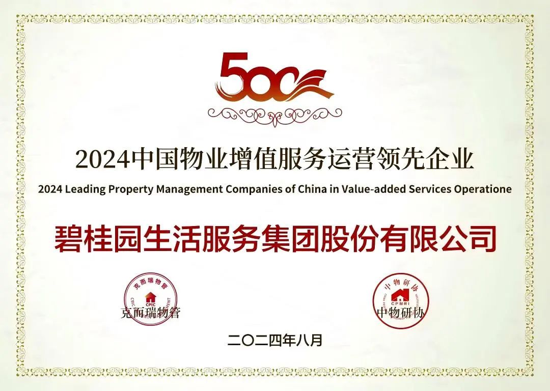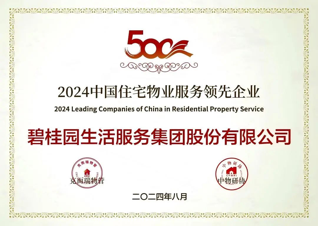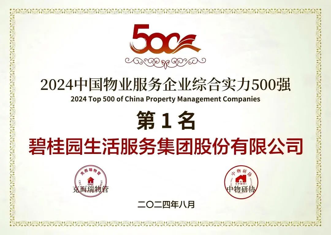 在「2024中国物业服务企业综合实力研究成果」中,碧桂园生活服务集团股份有限公司荣获“2024中国物业服务企业综合实力500强第1名”、“2024中国住宅物业服务领先企业”、“2024中国物业增值服务运营领先企业”、“2024中国物业社会责任贡献领先企业”、“2024中国物业管理卓越标杆项目——丹灶碧桂园(住宅)”奖项。
