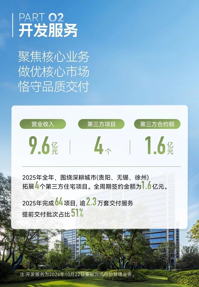 开发服务:作为2024年重组后的新增业务,全年实现营业收入9.6亿元。公司聚焦核心城市,成功拓展4个第三方项目,并恪守品质交付,全年完成64个项目、逾2.3万套交付,提前交付率达51%。同时,公司全力推进“好房子革命”,落地SIS精工技术体系与新自然主义园林,产品力持续迭代。