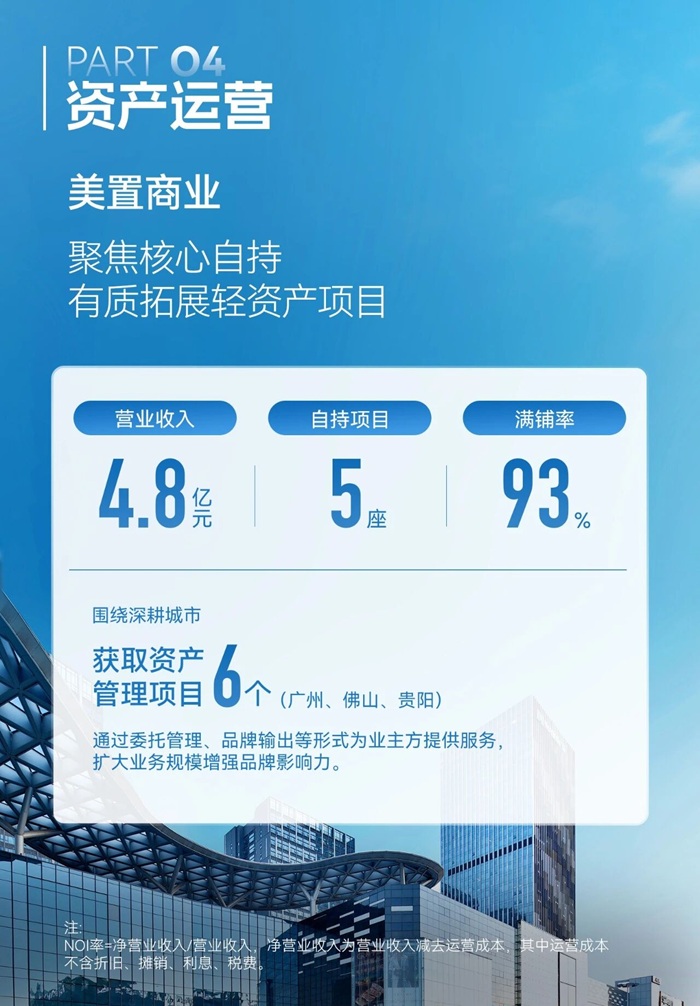 资产运营:包含美置商业与美置产发,合计贡献营收8.4亿元。商业板块聚焦自持项目运营与轻资产拓展,自持项目满铺率达93%;产发板块深耕广佛,运营项目出租率高达98%,并通过代建代管模式实现外拓增长。