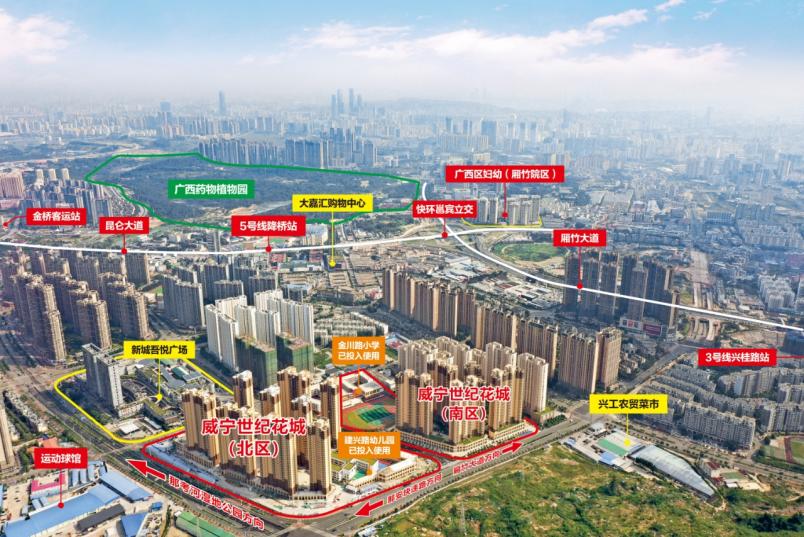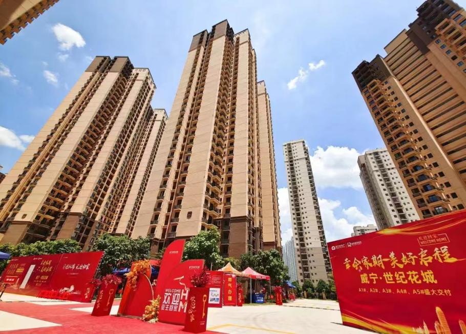威宁世纪花城经济适用住房项目由责任国企南宁威宁房地产开发有限公司进行开发建设;项目由两个地块(南区&北区)组成,其中:南区(2022年8月已交房)共5栋高层住宅,北区(预计2023年底交房)共9栋高层住宅。