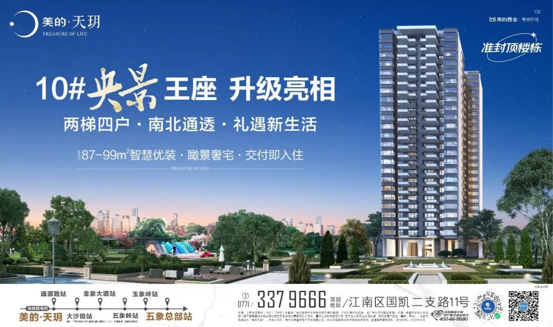 美的·天玥雄踞江南经开区正核芯区域,在俯瞰城市璀璨繁华的同时,近享难得的良凤江国家森林公园、五象岭森林公园等自然景观资源,蓝鲸商业广场、江南万达等商圈环绕,这也是美的·天玥热度不减的原因之一。在众人的热势追捧之下,美的·天玥不负全城厚爱,10#央景王座升级亮相。