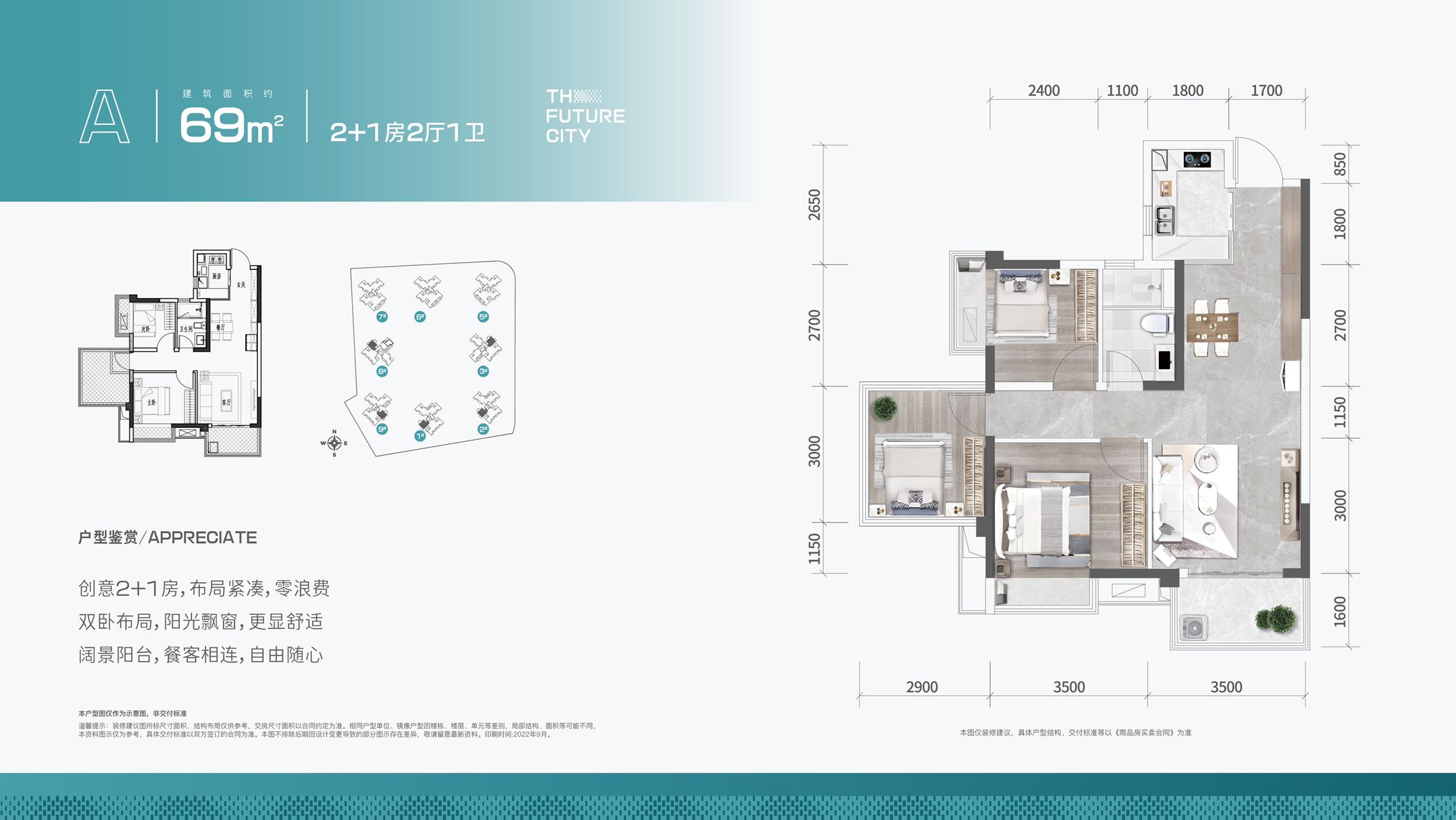 从户型区间来看,设计还是以刚需为主。69㎡做2+1房,布局紧凑,客餐厅进深超8米,南向阳台约5.6㎡;双卧附带飘窗,百变阳光房约8.7个㎡,可随意设计,且阳光房与飘窗、阳台面积为全赠送,整个户型属于真正的高拓展,而且通风采光及景观视野俱佳。