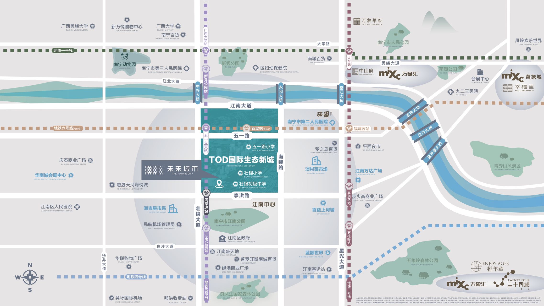 华润未来城市首期占地共52亩,位于江南区亭洪路 与壮锦大道交叉路口,毗邻地铁5、6号线(规划中)3大站点,即地铁5号线周家坡站D出口位置,从项目出发1站可达江南公园,3站广西大学,7站朝阳商圈,13站到万象城,可以说想去热门商圈都很方便。