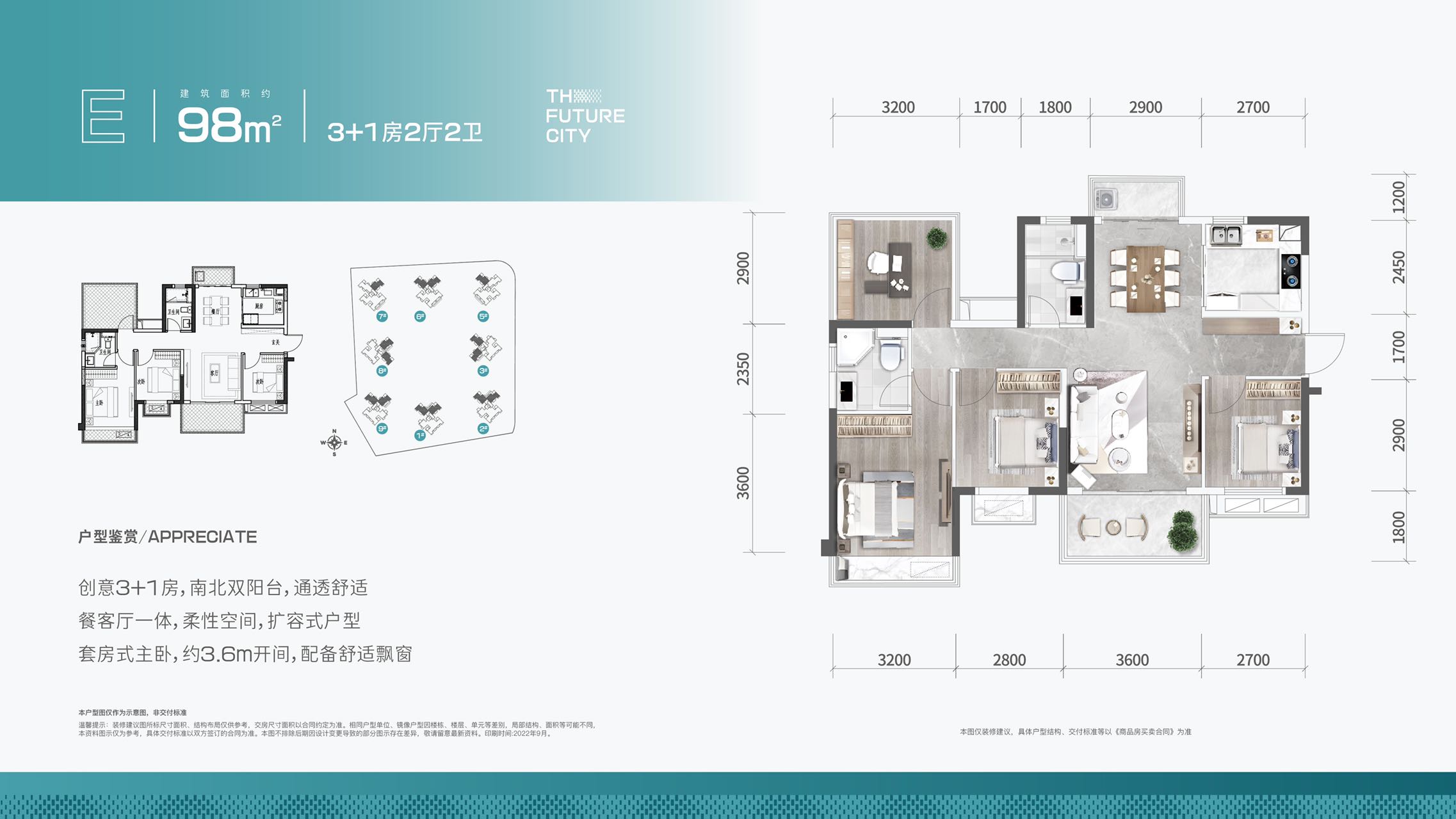 98㎡3+1房户型是项目最大户型,基本满足三代同堂的需求,设计有南北双向阳台,客餐厅为一体,观景与生活区分居住舒适度更佳;主卧带独卫与飘窗,开间达3.6米。