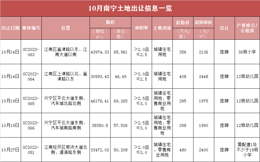 10月份,南宁将有5幅住宅用地出让,共289亩。位于江南区与兴宁区,均需配建学校。