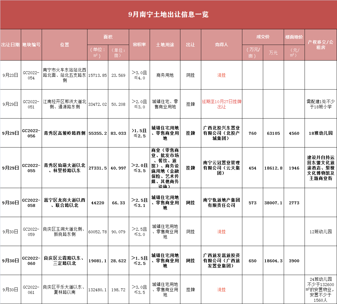 对比来看,9月的土地含金量更高,成功出让的均为位置较好的地段,如良庆区、青秀区。国企为拿地主力军,且楼面价都不高。