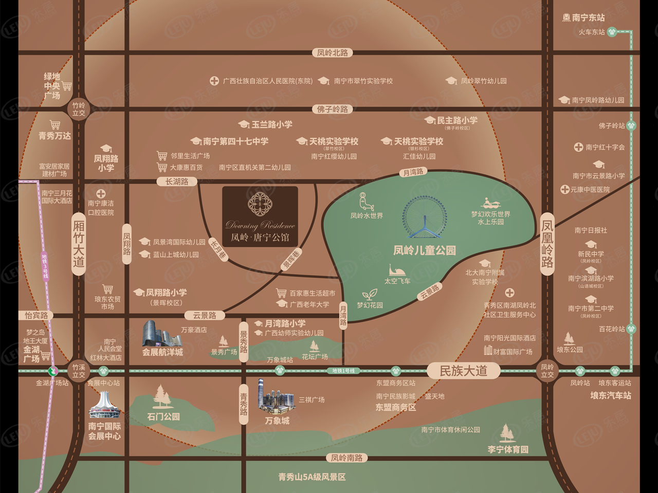 楼盘周边有商业配套东盟商务区商圈——华润万象城、盛天地、龙光世纪广场、三祺广场;会展商圈——航洋国际购物中心;琅东CBD商圈、民歌湖酒吧街区,医疗资源约2公里范围内有凤岭医院、南宁市第一人民医院琅东分院、医科大学附属琅东医院、广西壮族自治区人民医院(东院) 广西中医院大学附属凤岭北社区卫生服务中心。