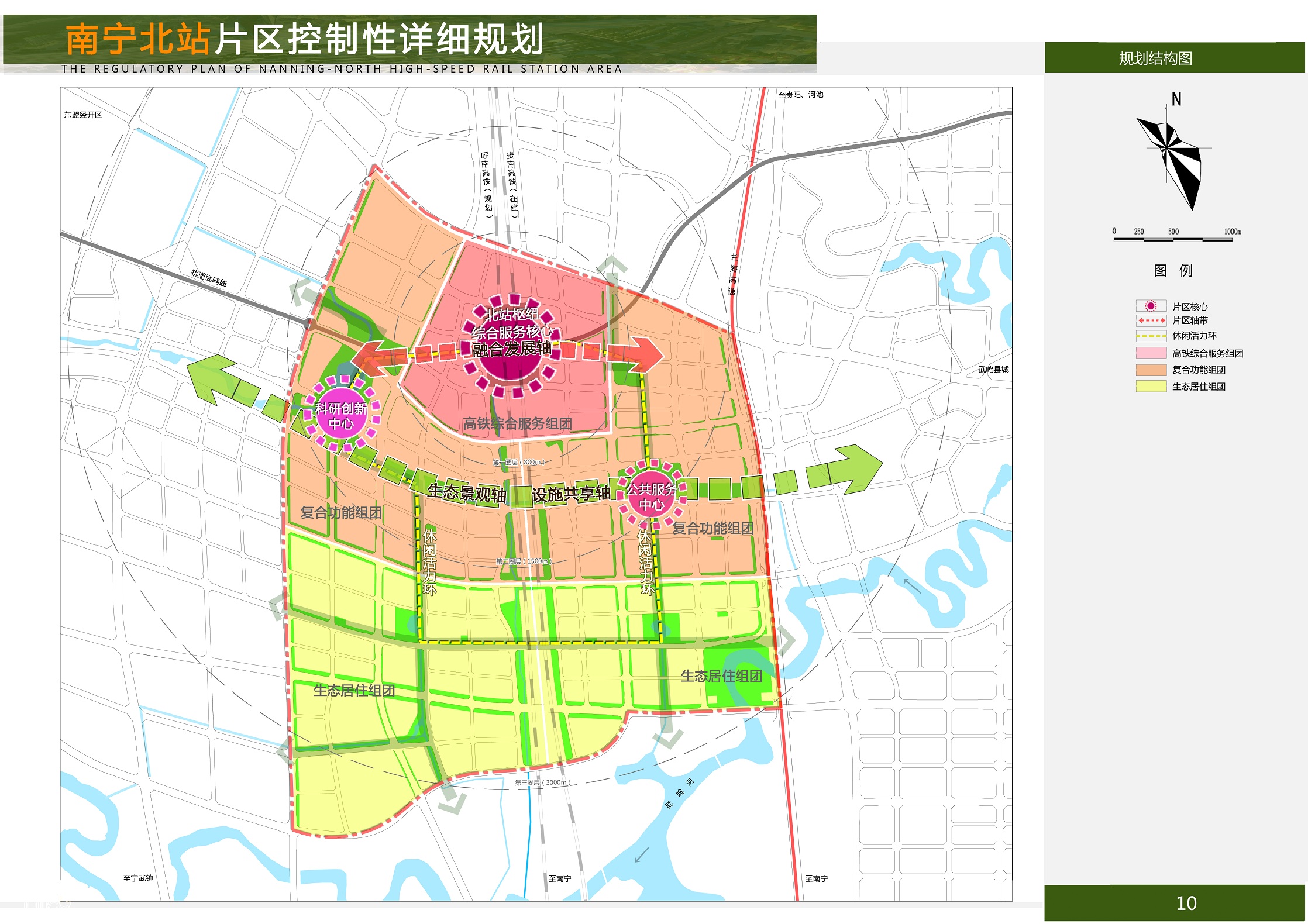 两轴:沿南宁北站枢纽东西延伸形成一条“站城人+产学研”融合发展轴;沿中部东西向水绿廊道形成一条生态景观与设施共享轴;