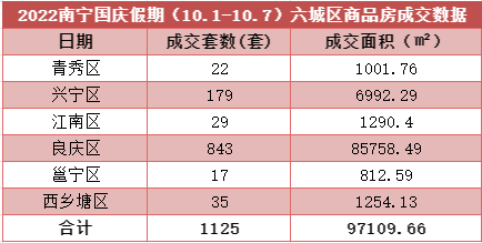 从六城区成交情况来看,良庆区的成交数据领跑,黄金周期间共成交套数843套,成交面积85758.49㎡;兴宁区位列成交榜单第二位,成交套数179套,成交面积6992.29㎡,其余城区成交均在两位数。