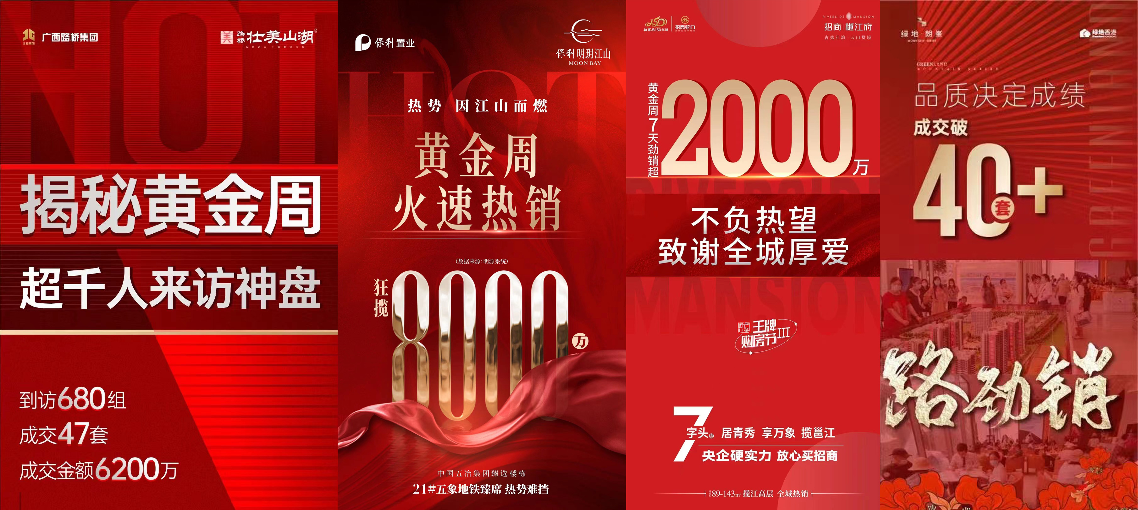 单盘项目的成交喜报有:路桥壮美山湖到访680组,成交47套,成交金额6200万元;保利明玥江山黄金周成交8000万元;招商樾江府黄金周成交2000万元;绿地朗峯成交突破40套;龙湖盛天双珑原著国庆热销5500万元,龙湖郁林府热销5000万元等。