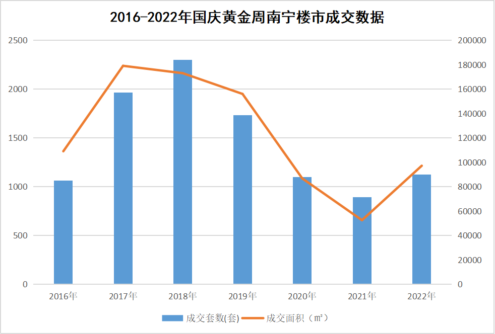 据南宁住建局发布的成交数据显示,2022年10月1日-7日,南宁商品房成交套数为1125套,同比2021年上涨25.98%;成交面积为97109.66㎡,同比2021年上涨了85.17%,较去年有所回升。另外从折线图中可以看到,2022年的销量水平接近2016年和2020年的销量,成交顶峰在2018年,是2022年成交量的两倍。