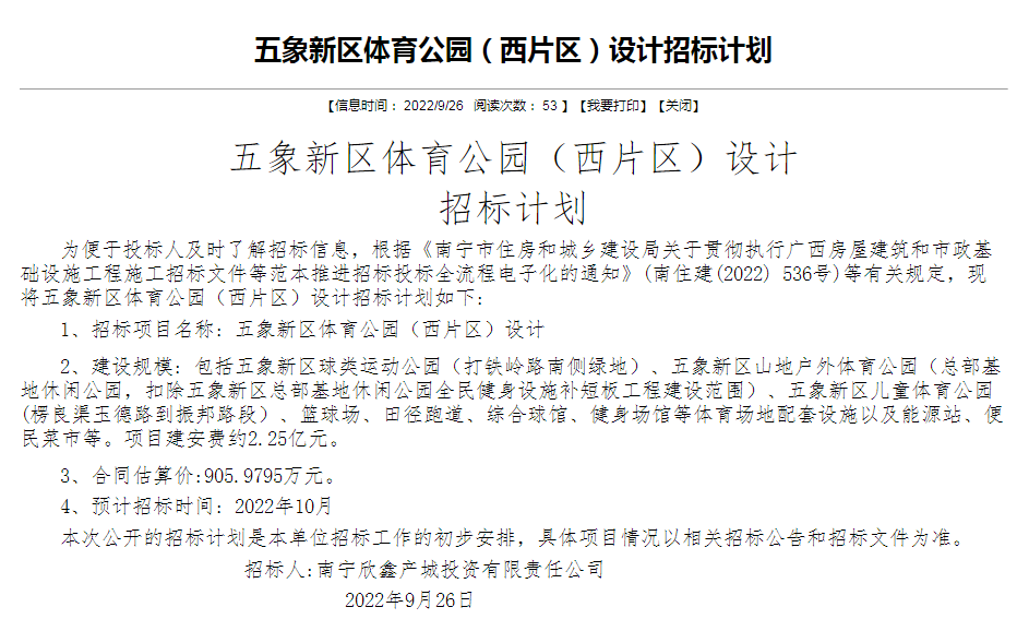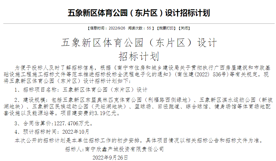 9月26日,乐居据南宁市公共资源交易平台获悉,南宁欣鑫产城投资有限责任公司发布五象新区体育公园西片区与东片区设计招标计划公告。