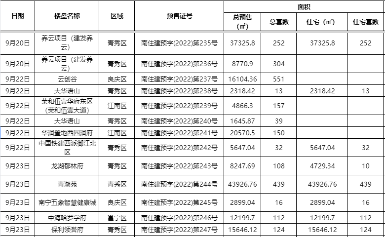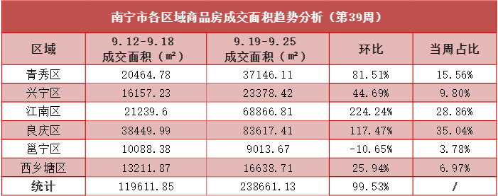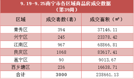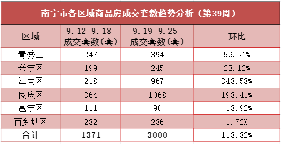 根据南宁市住房和城乡建设局公布的数据统计,2022年第39周(9.19-9.25)南宁商品房网签套数3000套,环涨118.82%;网签面积为238661.13㎡,环比上涨99.53%。