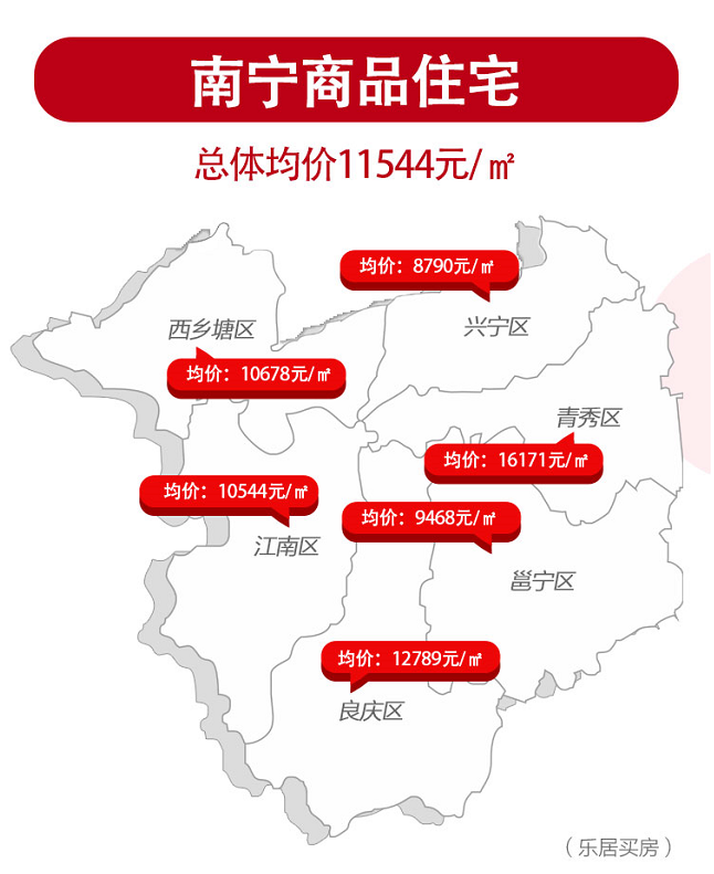 价格方面,据乐居新房中心统计,上周南宁在售楼盘均价11544元/㎡,其中,青秀区均价为16171元/㎡,良庆区均价为12789元/㎡,邕宁区均价为9468元/㎡,兴宁区均价为8790元/㎡,西乡塘区均价为10678元/㎡,江南区均价为10544元/㎡。