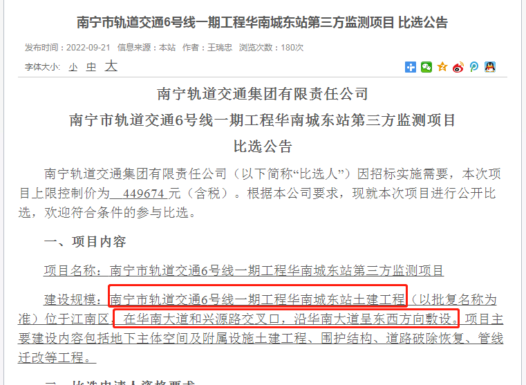 乐居买房讯 9月21日,乐居据南宁轨道交通官网获悉,一则关于南宁市轨道交通6号线一期工程华南城东站第三方监测项目比选公告发布。