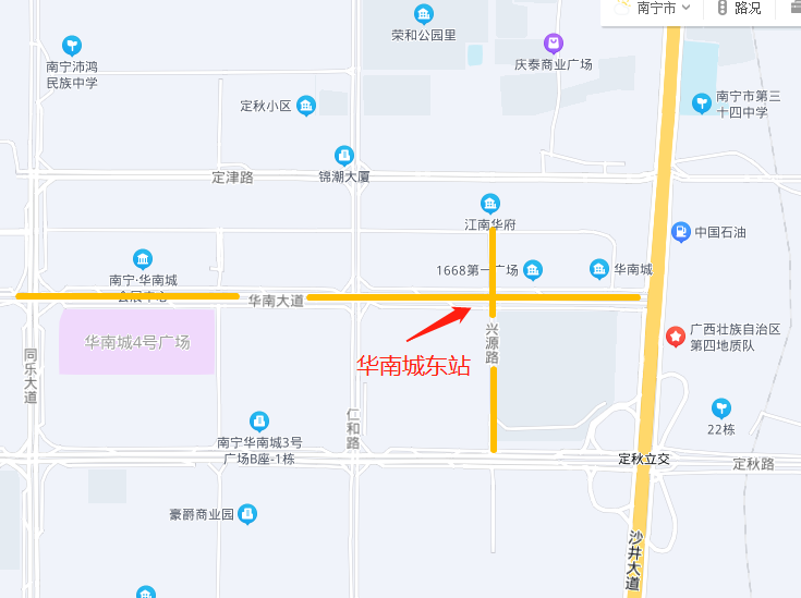 根据公告显示,南宁市轨道交通6号线一期工程华南城东站站点大概位置已经确定,华南城东站土建工程位于江南区华南大道和兴源路交叉口,沿华南大道呈东西方向敷设。