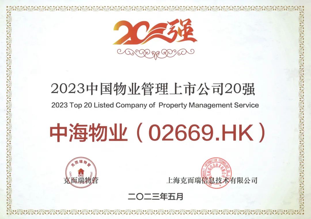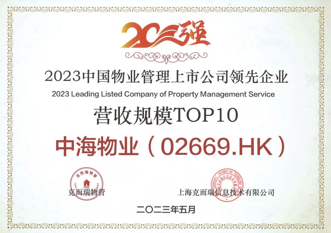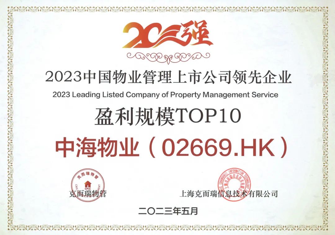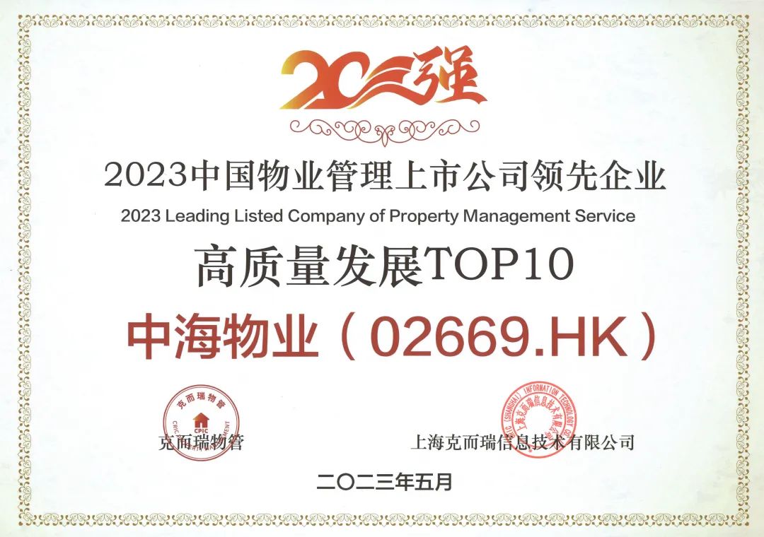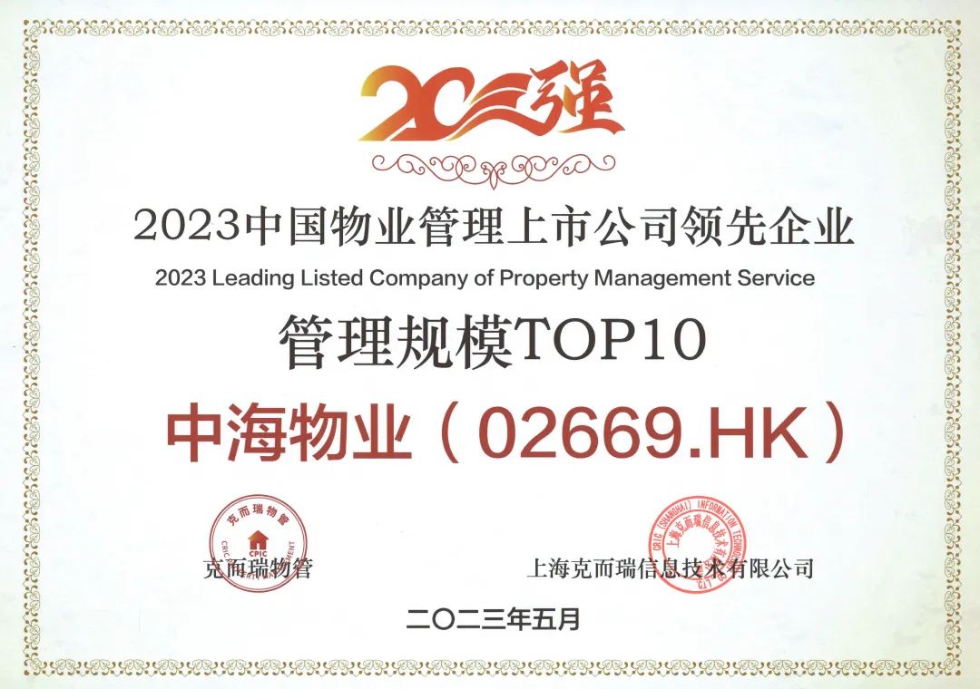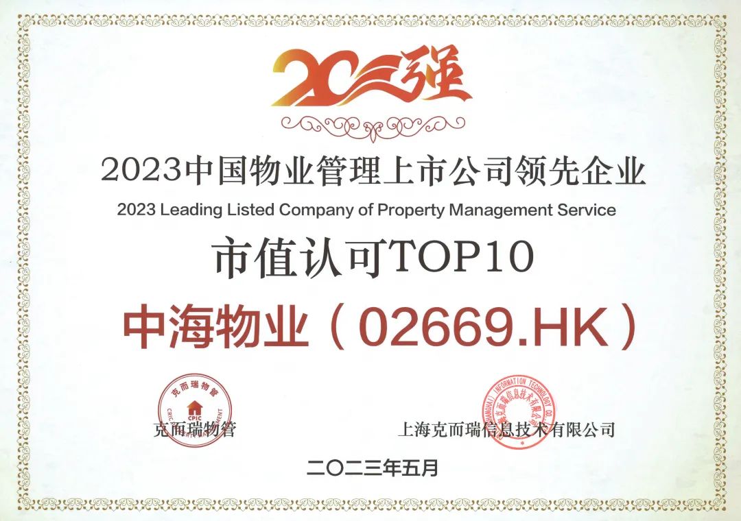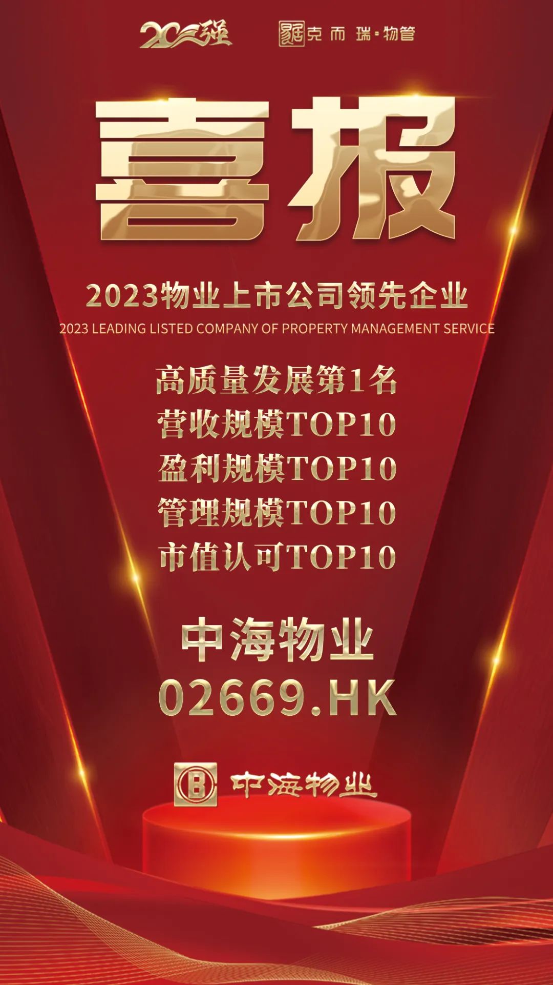 在「2023物业服务企业上市公司研究成果」中,中海物业荣获“2023中国物业管理上市公司20强”、“2023中国物业管理上市公司领先企业营收规模TOP10”、“2023中国物业管理上市公司领先企业盈利规模TOP10”、“2023中国物业管理上市公司领先企业管理规模TOP10”、“2023中国物业管理上市公司领先企业市值认可TOP10”、以及“2023中国物业管理上市公司领先企业高质量发展TOP10”奖项。