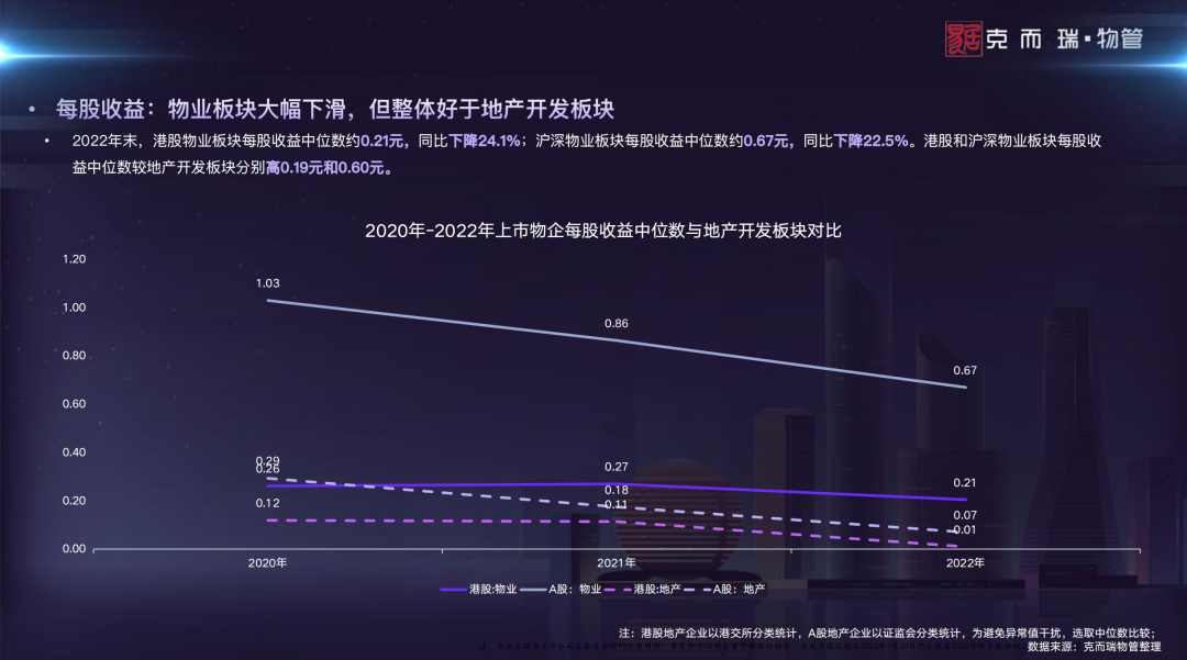 再看每股收益,整体物业板块去年的每股收益大幅下滑,即便如此,其实仍比地产板块要好一些,表现更好的是沪深上市的几家物业公司,每股收益中位数达到了0.67元。