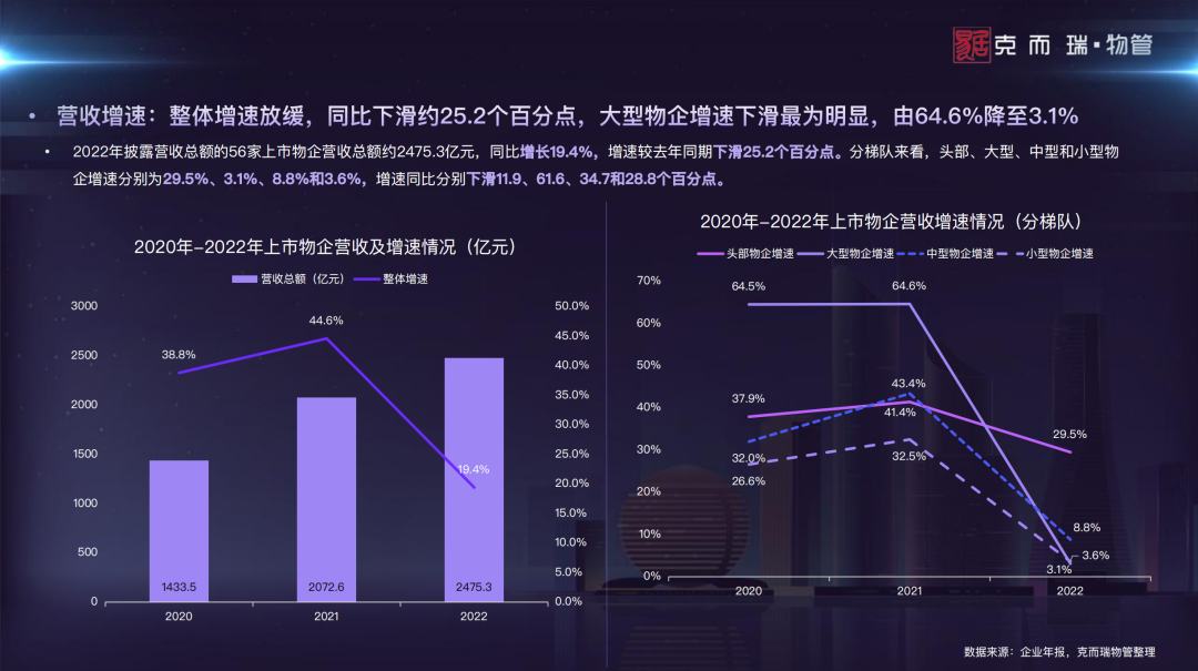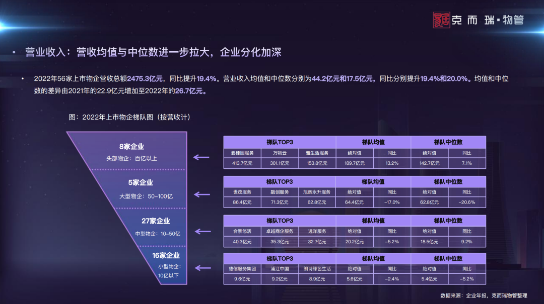 今年上市物企的整体的营收分四个梯度:百亿、50到100亿,10到50亿和10亿以下的,整个的各个梯度各家的差距进一步扩大,表明企业的分化在加剧。