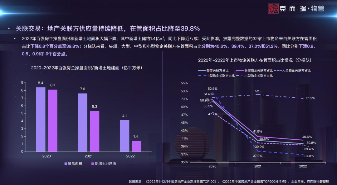 此外,整体的合约面积也是延续下滑趋势,比去年同期下降24个百分点,每个梯度都有不同程度的下滑。当然,整体下滑的最核心原因与地产关联方的持续降低,物业企在管面积降低有关。