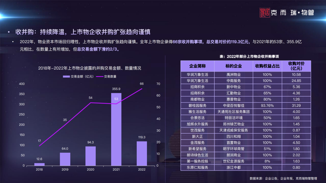 同时,我们发现,去年合约面积下滑严重与整体的收并购下降有关。去年,行业只有66个收并购案例,而总金额低至119亿,这一金额是前年的1/3。从收并购可以看出来整体市场相对来说趋向于理性,预计明后年可能会继续下滑。