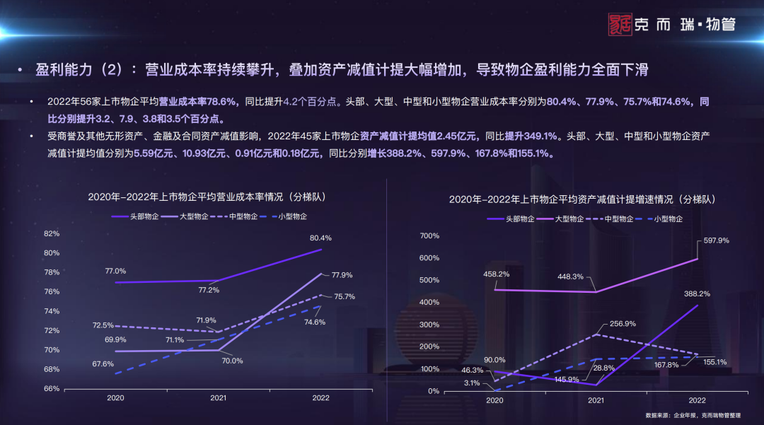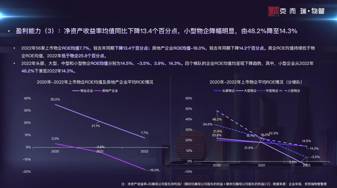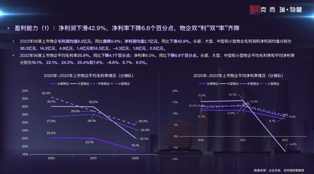 造成这种状况的核心原因与去年企业本身的规模扩张、平均运营成本率上升有关,这些因素合在一起导致目前的盈利能力全面下滑,延续了2021年增收不增利的现象。在盈利能力全面下滑之后,我们发现物企的整体收益率目前只有7.1%,也是下降特别明显。
