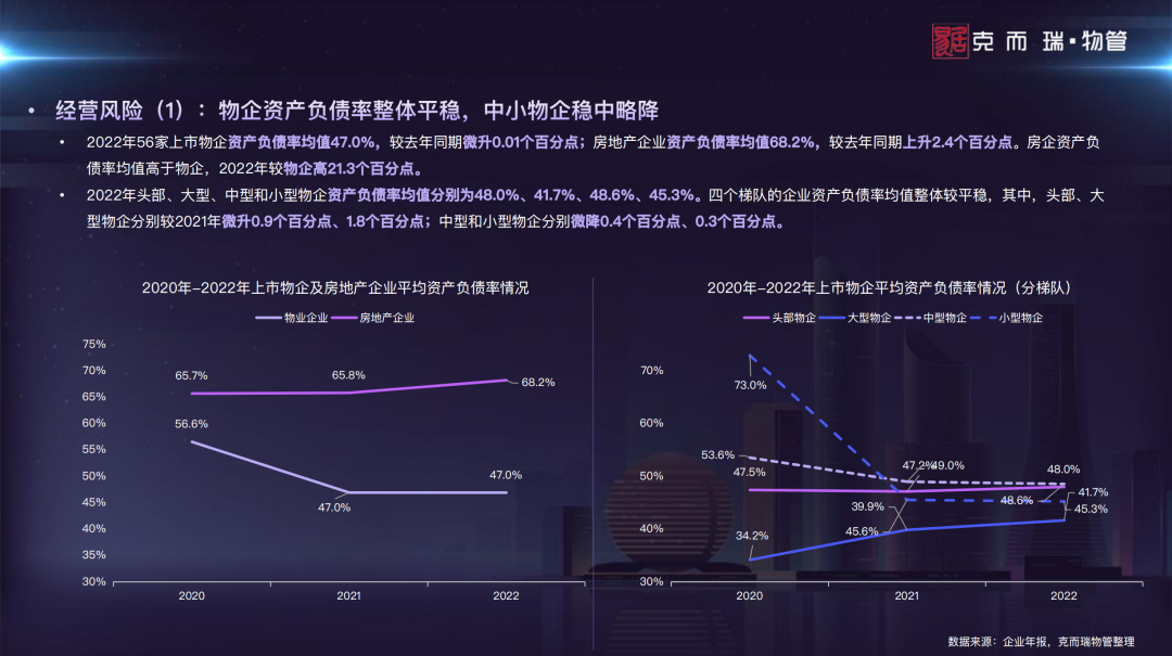 再来看物企的经营风险,整体的资产负债率这几年没有变化,差不多在45%-47%左右,不管是大公司还是小公司都保持在这个基数上。