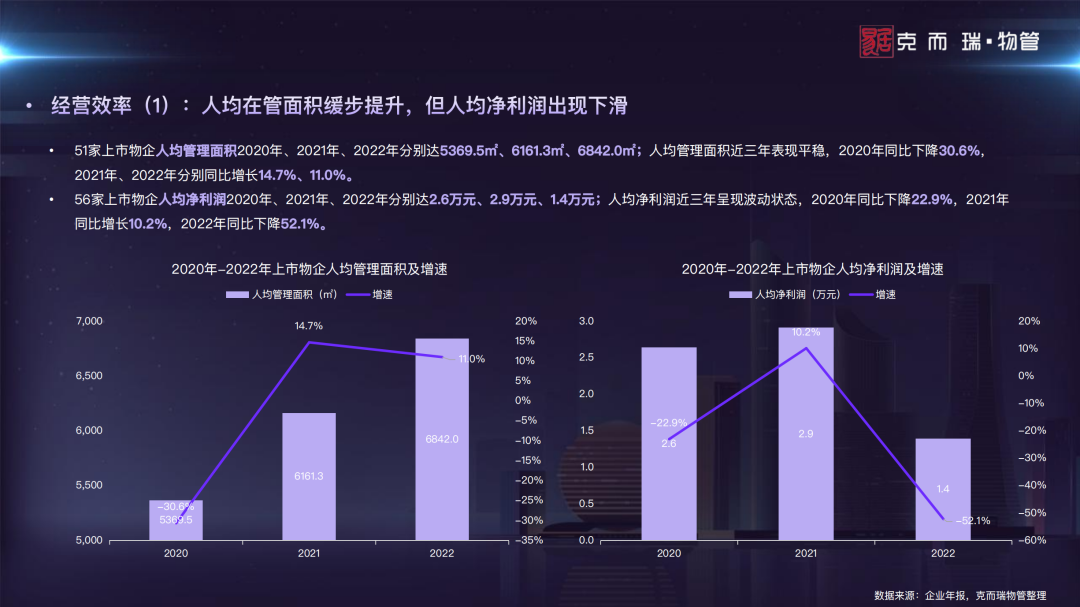 再看一下经营效率,这一指标反而在提升。企业的整体人均在管面积达到6800㎡,但是人均净利却下降了,出现了“增员减效”的现象,也就是说,人员在增加,但是人员创造的效率在下降。