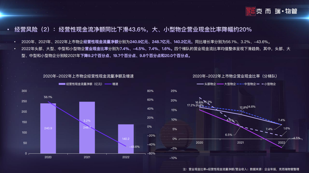虽然净资产负债率不高,但是企业的经营型现金流下滑的过于严重,同比下降超过43%,现金流量净额从248亿元降到今年的140亿元,而且小型物企下降更严重。