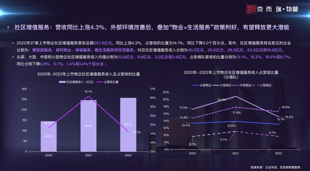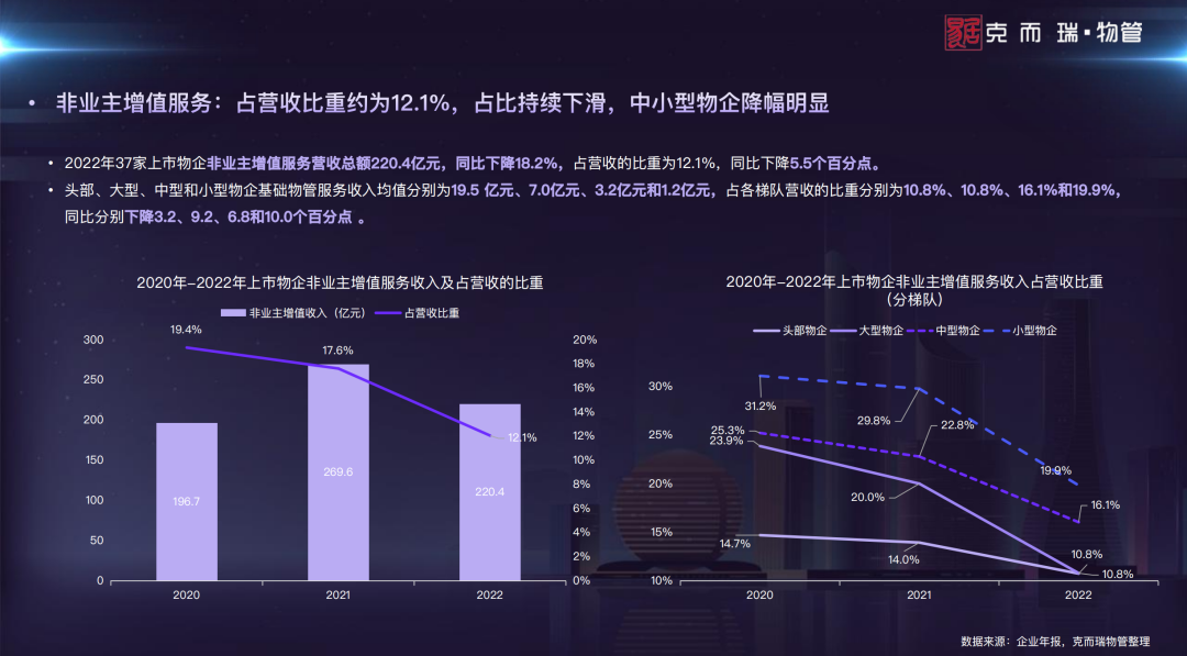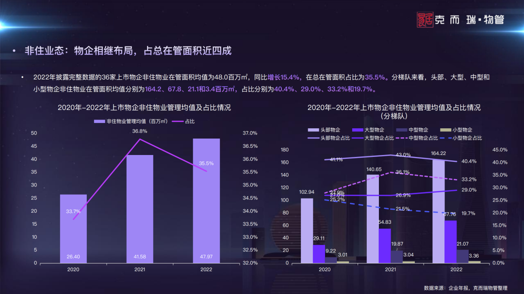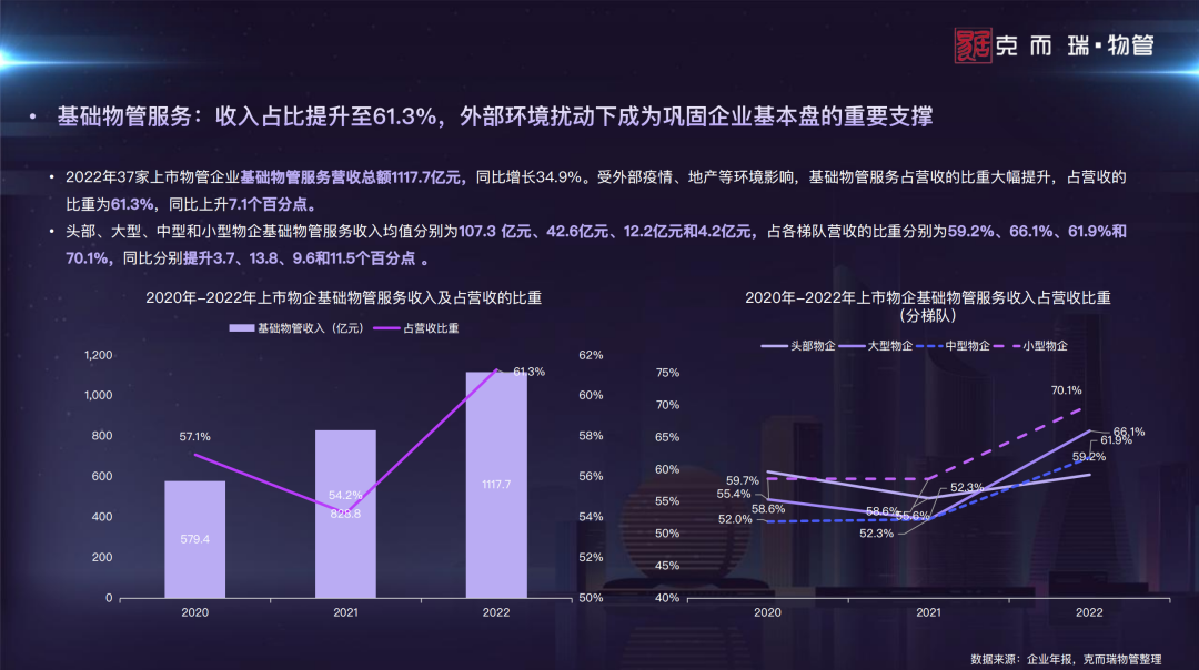 除了住宅物业之外,物业公司还有第二增长曲线,目前来看,第二增长曲线已经显示出该有的担当。我们先看一个数字,去年因为一些原因不好开展,企业的基础物管占比提升了61%,在市场最难的时候,基础物管收入是物业公司的压舱石,未来我们也希望物业公司把这一块越做越好。