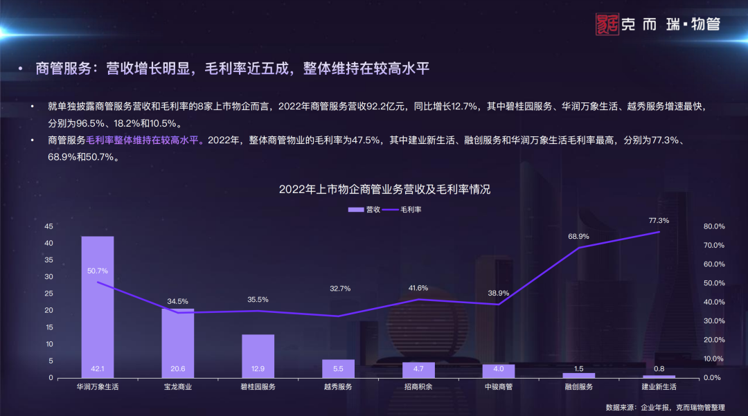 这里单独看一下商管服务,目前已公布的八家公司的商管服务,其营收增长了12%,毛利率没有低于30%的企业,个别企业甚至高达70%。未来商管怎么布局,对于提高企业经营质量特别重要。
