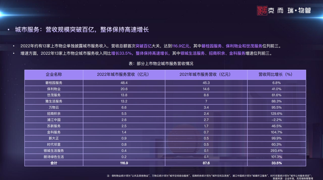 另外,还有大家都在提的城市服务,去年公布的13家企业整体营收已经突破了100亿大关,而且整体的平均增长率33.5%。这个数据就比较科学了,比增值服务的增长更好,物业公司布局的城市服务板块目前已经在担当比较重要的任务了。
