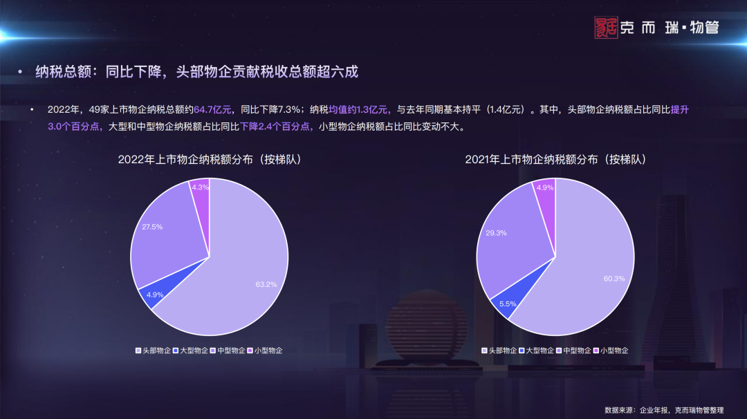 最后是社会责任,首先看一下纳税,物业企业的纳税总额下降了7.3%,平均纳税一亿多,头部企业纳税占了60%。