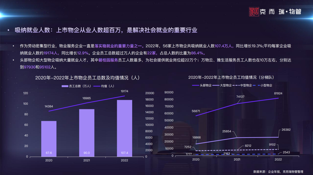 现在来看,能提供就业的行业其实就是好行业,物业公司在这方面表现的比较好:上市公司的从业人数超过100万,按自有员工和外包员工的比例来看,光上市公司提供的人数就有3、4百万。