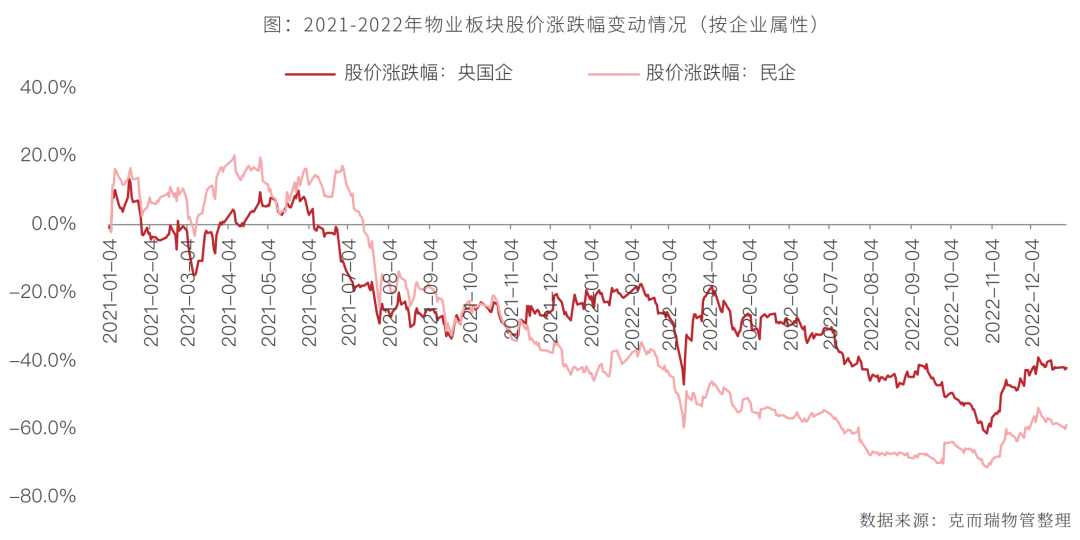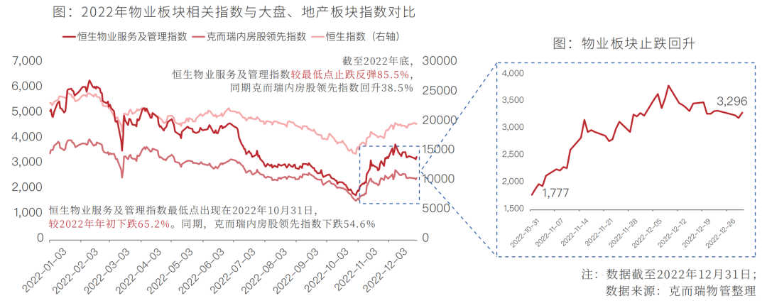 面对复杂多变的内外部环境,房地产行业以及物业管理行业在寒冬中艰难前行。从资本市场来看,地产板块指数与物业板块指数走势基本保持一致,且整体表现均弱于大盘。恒生物业服务及管理指数最低点出现在2022年10月31日,较2022年年初下跌65.2%。同期,克而瑞内房股领先指数下跌54.6%。