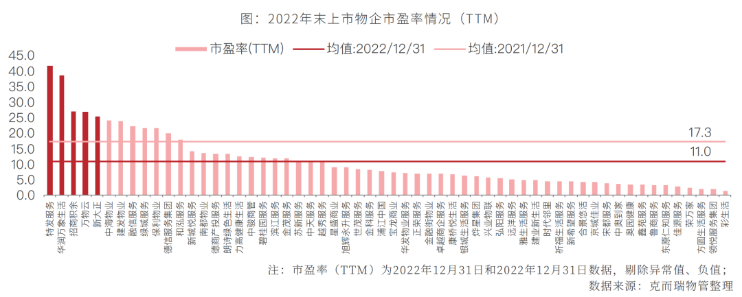 从估值角度来看,当前上市物企呈现以下特征:一是,市盈率大幅度回落。截至2022年12月31日,上市物企市盈率均值约为11.0,与2021年年底的17.3相比下降了7.3个百分点。二是,央国企、聚焦非住赛道的物业服务企业获市场认可。2022年底,市盈率排名前五的企业分别为:特发服务(41.8)、华润万象生活(38.6)、招商积余(27.0)、万物云(26.8)、新大正(25.4)。