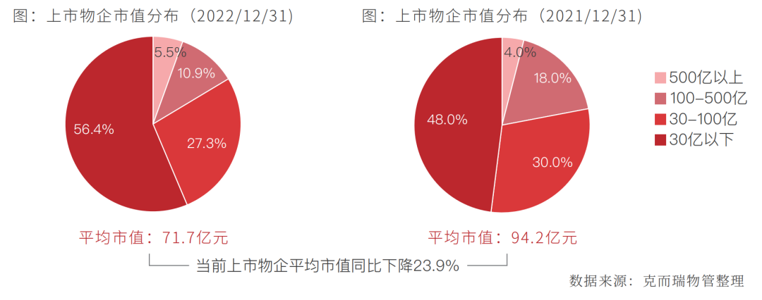 截至2022年12月31日,市值在30亿以下的物企占比近6成,占比较2022年年初增加8.4个百分点。百亿市值以上的物企有9家,数量较2022年年初减少2家,百亿市值以上企业分别为华润万象生活、碧桂园服务、万物云、中海物业、保利物业、招商积余、绿城服务、雅生活服务和融创服务。