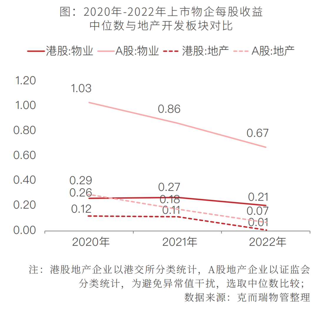 从每股收益角度来看,物业板块每股收益大幅下滑,但整体好于地产开发板块。2022年末,港股物业板块每股收益中位数约0.21元,同比下降24.1%;沪深物业板块每股收益中位数约0.67元,同比下降22.5%。港股和沪深物业板块每股收益中位数较地产开发板块分别高0.19元和0.60元。