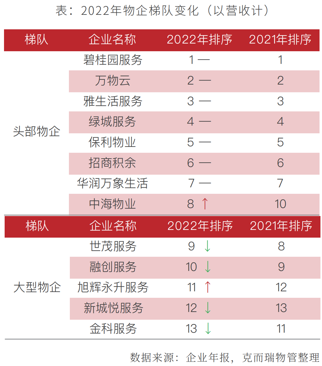从市场格局来看,整体呈现头部物企稳定,大中型物企承压,小型物企稳中有升的特征。头部物企名次变动率仅为12.5%,整体保持稳定不变,仅中海物业名次上升,2022年其营收达到113.4亿元,同比提升34.4%。