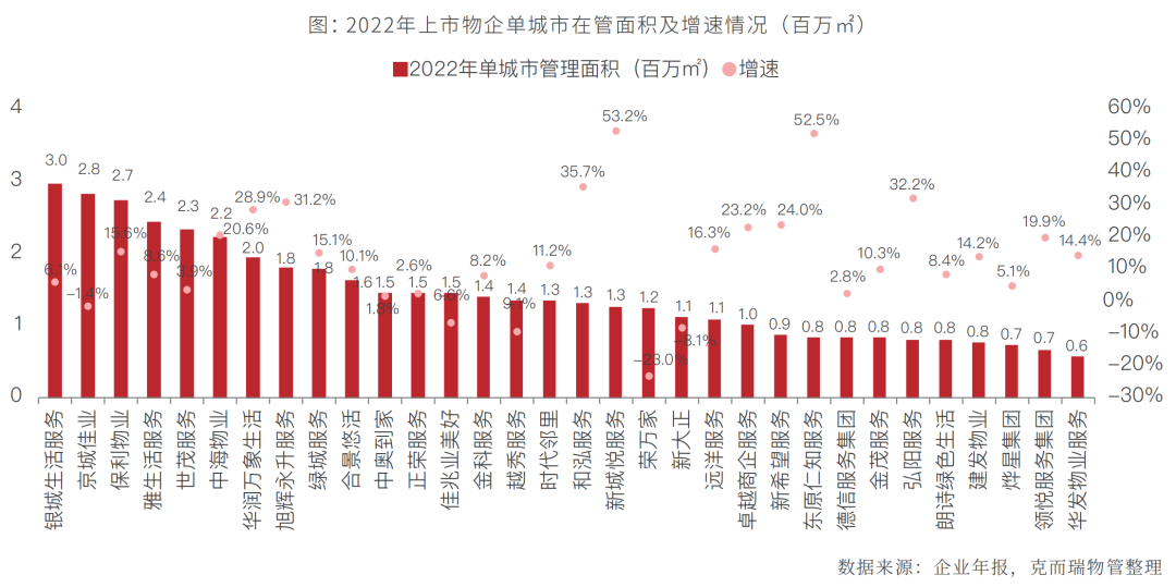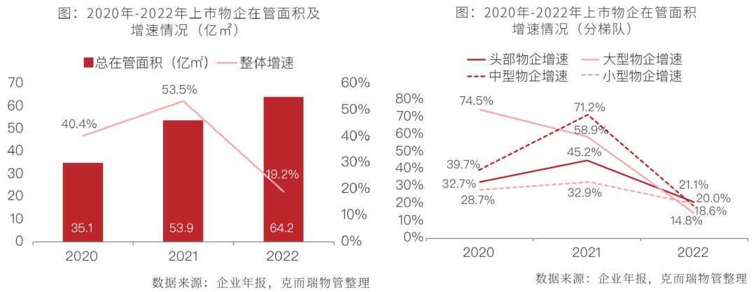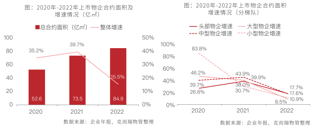 2022年,在疫情、地产、资本、整体经济环境等因素的影响下,诸多上市物业企业放缓发展脚步,相较于开拓新市场,拓张规模,更多的将精力集中在提升服务品质、增强盈利能力上,上市物企整体在管规模虽进一步增加,但增量显著减少,增速大幅下滑。