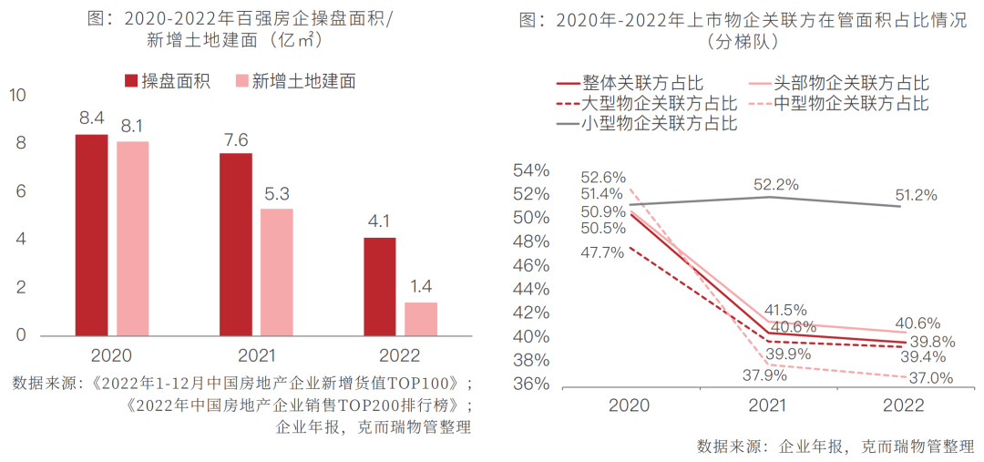 2022年房企操盘面积腰斩,意味着近期承接来自地产开发板块的管理面积可能打五折,而新增土地面积的断崖式下滑则是预示着未来数年新增交付的住宅面积将持续下降,物业公司从地产母公司获取的在管面积也将持续减少。从年报数据来看,完整披露相关数据的32家上市物企来自关联方的在管面积占比同比下降0.8个百分点至39.8%。分梯队来看,头部、大型、中型和小型物企关联方在管面积占比分别为40.6%、39.4%、37.0%和51.2%,同比分别下滑0.9、0.5、0.9和1.0个百分点。