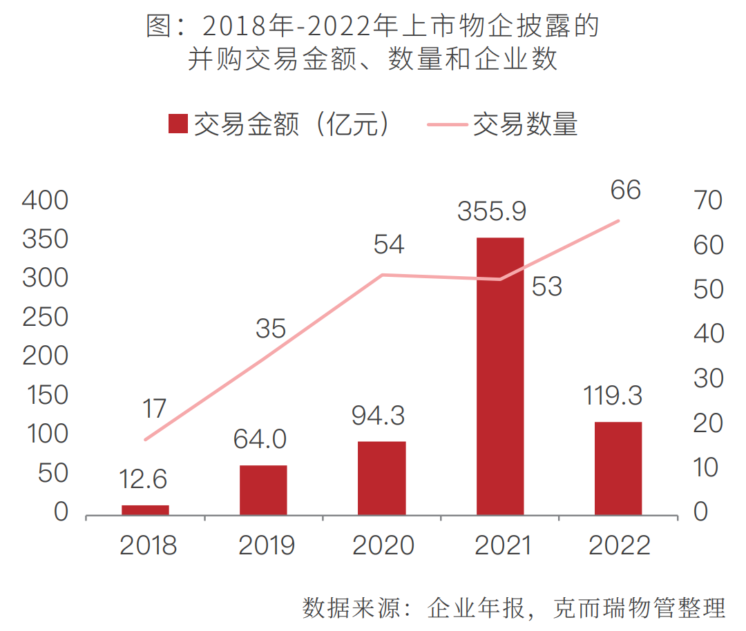 收并购是企业快速提高管理规模的重要方式。2022年,收并购退潮到来,据统计,年内上市物企共发起66宗收并购,总涉及金额约119.3亿元。相较于2021年的53宗交易、355.9亿元总额,在收并购频率上有所增长,但交易总额下滑约2/3。