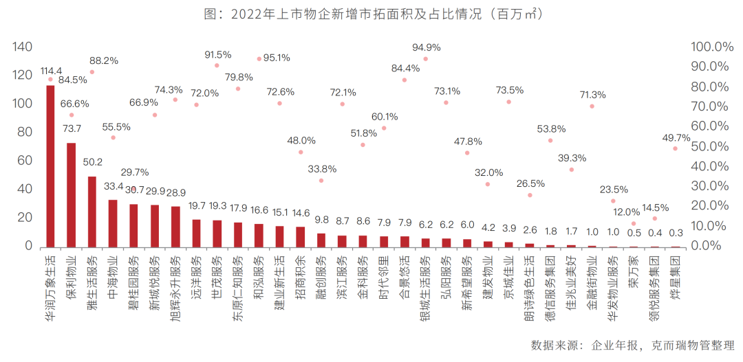 从上市企业数据来看,31家披露完整数据的上市物企2022年共新增在管面积约8.46亿㎡,其中来自独立第三方项目约5.43亿㎡,占其总新增在管面积的64.2%。从企业角度看,共16家企业新增第三方面积占比高于均值,华润万象生活、雅生活服务、世茂服务、和泓服务、合景悠活及银城生活服务共6家物企该占比高于80%。