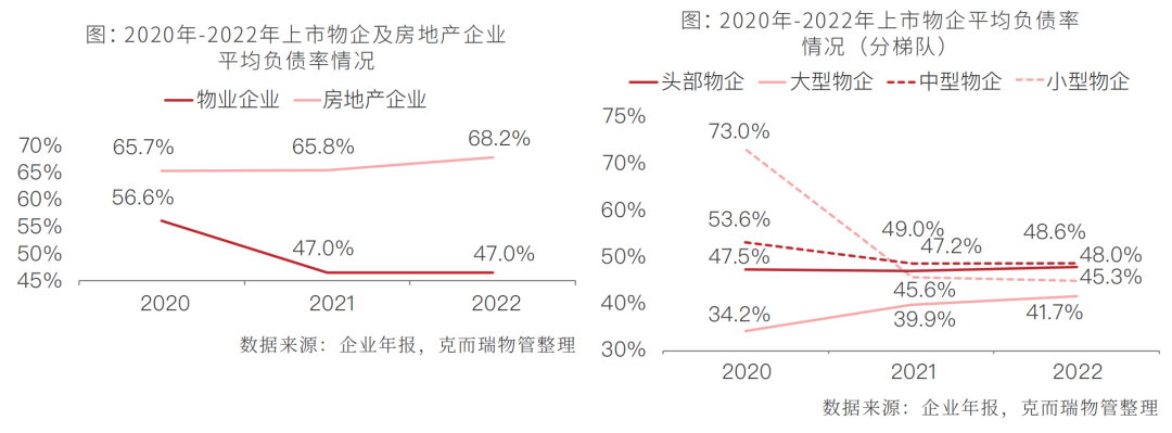 2022年56家上市物企资产负债率整体平稳,与2021年水平基本持平。物企以轻资产业务发展为主,2022年业内收并购趋于谨慎,数字化投入、城市服务业务发展趋于平稳,对企业造成波动的大笔支出有限。