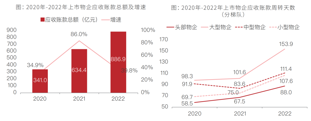 2022年房企遇冷给关联物企带来较大影响,比如前介业务、案场服务以及车位代销等传统关联业务的延期支付,以及开发商交付未售空置房也造成物业费拖欠,结合疫情等整体拉高了物企的应收账款总额。