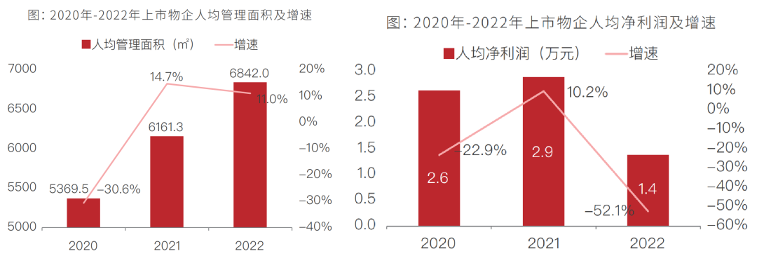 51家上市物企人均管理面积2020年、2021年、2022年分别达5369.5㎡、6161.3㎡、6842.0㎡;人均管理面积近三年表现平稳,2020年同比下降30.6%,2021年、2022年分别同比增长14.7%、11.0%。