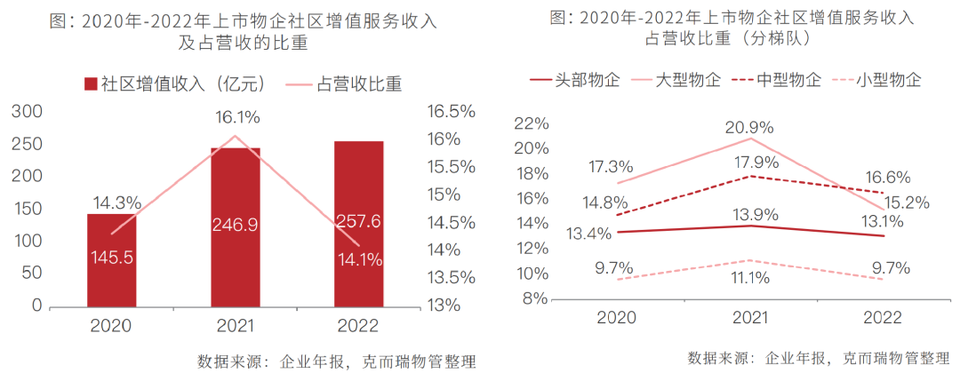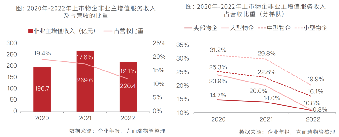 二、非业主增值服务:占营收比重约为12.1%,占比持续下滑,中小型物企降幅明显