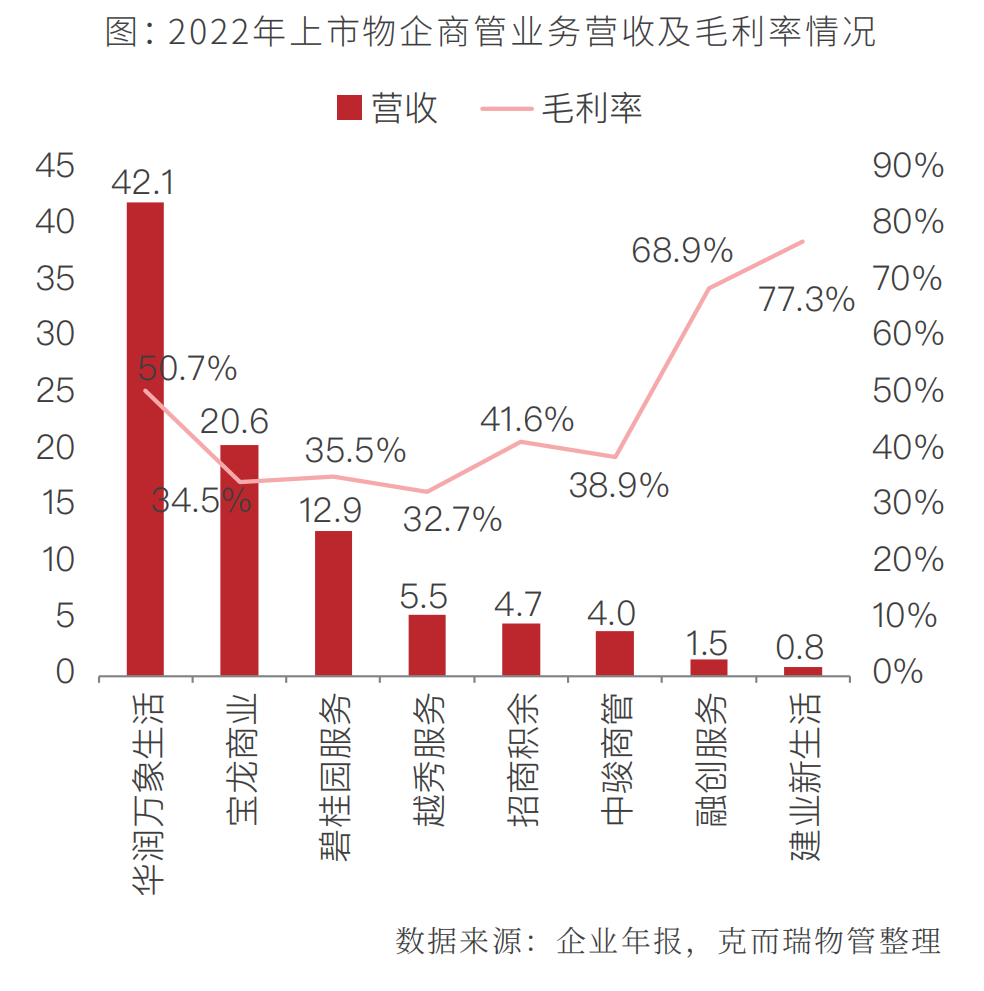 商管服务毛利率整体维持在较高水平。2022年,整体商管物业的毛利率为47.5%,其中建业新生活、融创服务和华润万象生活毛利率最高,分别为77.3%、68.9%和50.7%。