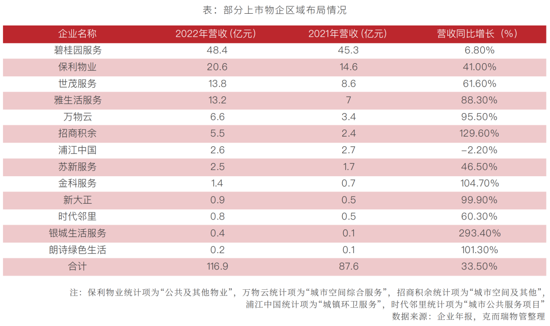 2022年约有13家上市物企单独披露城市服务收入,营收总额首次突破百亿大关,达到116.9亿元,其中碧桂园服务、保利物业和世茂服务位列前三。