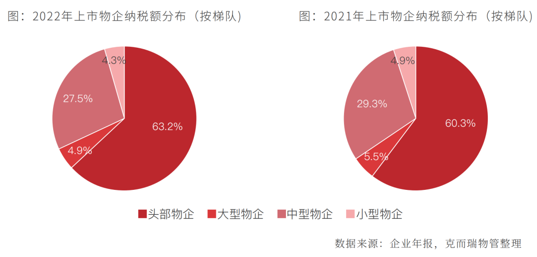 物业服务企业积极承担纳税义务。受净利润下滑影响,2022年,49家上市物企纳税总额约64.7亿元,同比下降7.3%;纳税均值约1.3亿元,与去年同期基本持平(1.4亿元)。其中,头部物企纳税额占比同比提升3.0个百分点,大型和中型物企纳税额占比同比下降2.4个百分点,小型物企纳税额占比同比变动不大。